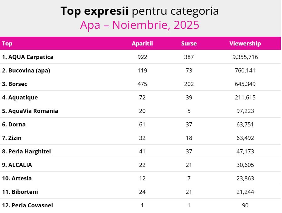 Aqua Carpatica este lider în topul celor mai vizibile branduri de apă în online la categoria “Top expresii“ pentru luna decembrie 2025, informează iqads.ro.